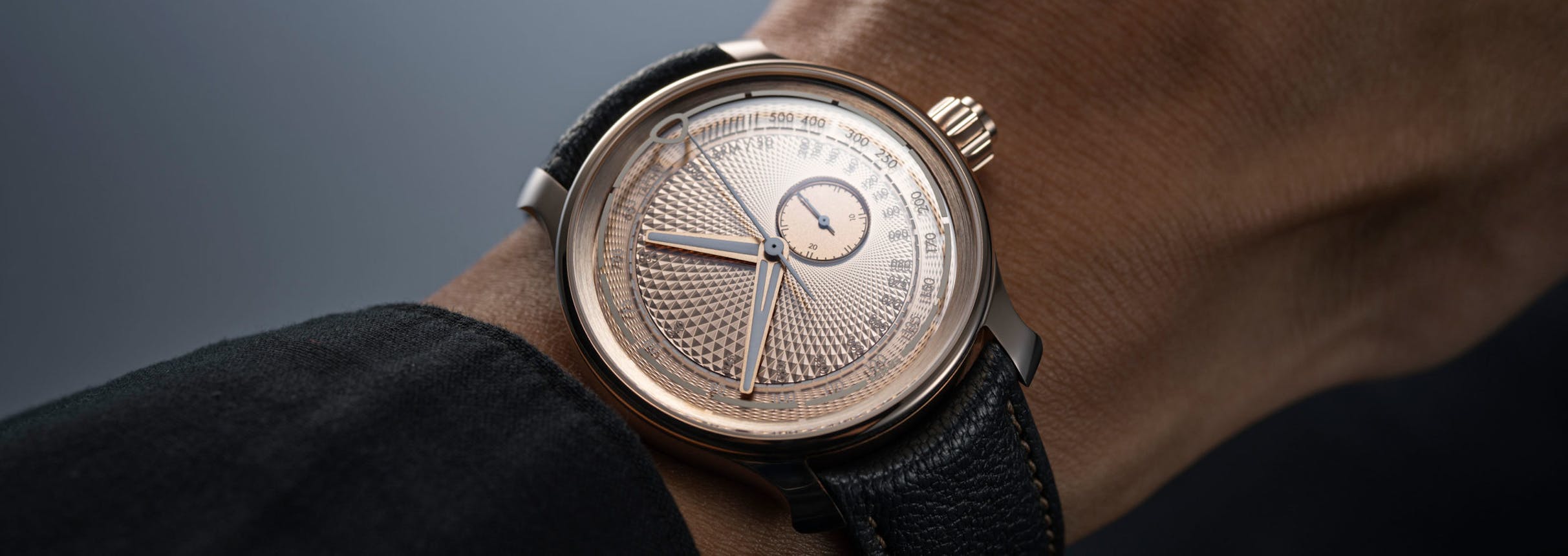 The MING 37.04 RG: Case, 38mm x 11.9mm, in 18k 5N rose gold, doubled domed sapphire front and back with double AR coating. Sapphire dial with subdial recess and inlaid Super-LumiNova X1 over a solid rose gold guilloché pattern dial by Comblemine. Water resistance, 50M. Movement, La Joux Perret 5000.M1 for MING, 5N rose gold coated and sandblasted skeletonized bridges and plates with hand-polished dome-profile anglage; monopusher chronograph, hand wound with a 38 hour power reserve. 20mm lug width with curved quick release springbars, and strap by Jean Rosseau Paris. Price, CHF 48,000, limited to 20 pieces world wide, with deliveries in Q2-2024. For more information and to enquire about ordering, visit Horologer MING.