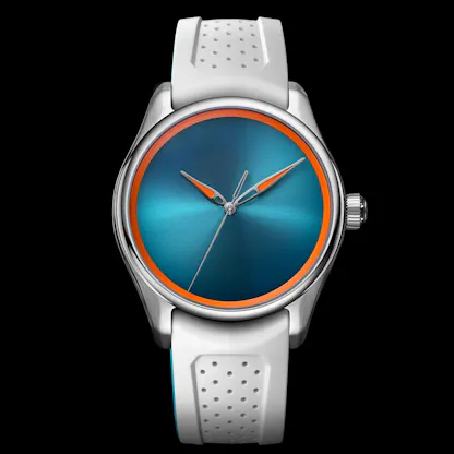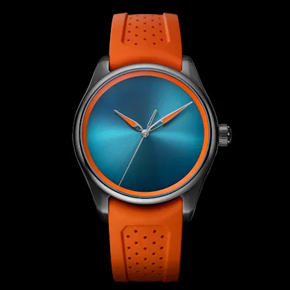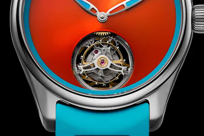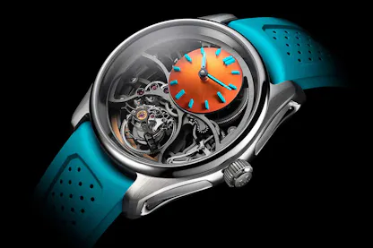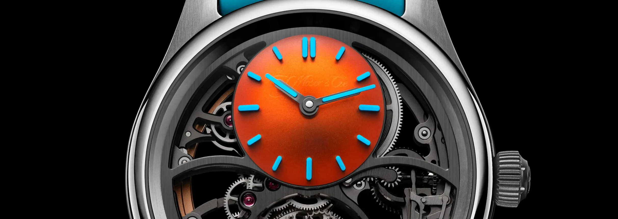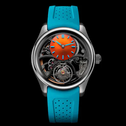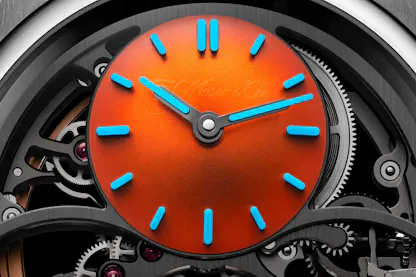 There are just two basic colors although you have the impression of more thanks to the way the blues and oranges are distributed. The hands on the Centre Seconds and Tourbillon models are partly skeletonized, letting the dial color show through (the solid dials on both models have a sunray brushed finish) and there’s a contrasting ring at the edge of each dial. There’s no dial furniture, except for the indexes on the Skeleton Cylindrical Tourbillon subdial, in keeping with the minimalist ethos of the brand, which has gone so far as to suppress its own wordmark on many of its watches in the interests of visual clarity.
