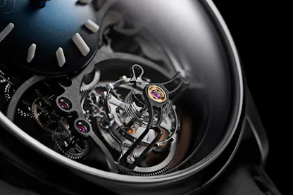 The movement is caliber HMC 805, which is an unusual flying tourbillon with double balance springs. The tourbillon cage is also driven via gear teeth at its periphery, unlike conventional tourbillons which turn on a central pinion, driven by (usually) the movement third wheel.