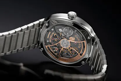 The Moser Streamliner Perpetual Moon Concept Meteorite, ref. 6270-1200: case, stainless steel with integrated Streamliner bracelet, 40mm x 13.2mm including the highest point of the domed sapphire crystal; sapphire crystals front and back; 120M water resistance. Movement, HMC 270 caliber, 32.0mm x 6.3mm, running at 21,600 vph in 27 jewels; bi-directional automatic; 72 hour power reserve; semi-skeletonized. Moser Straumann balance spring. Hours, minutes, central seconds hand with stop seconds; moonphase adjustable with pusher on the case flank. Price, $43,700.