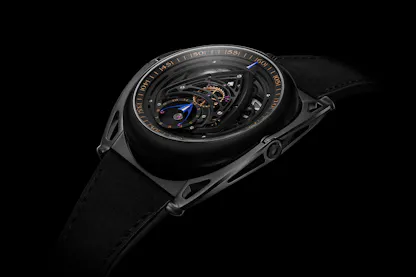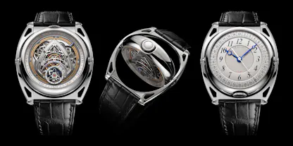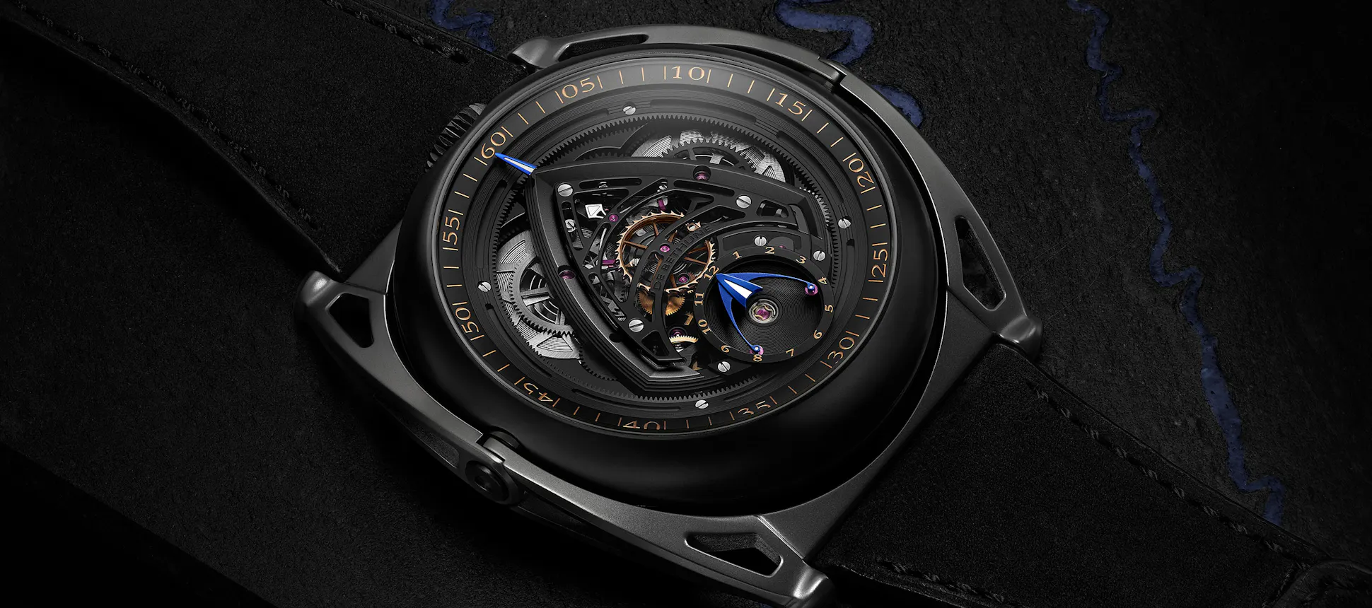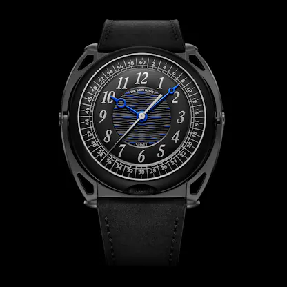 The Swizz Beatz x De Bethune Kind Of Two Jumping GMT Season 3: case, blackened titanium with black zirconium floating lugs, 43.3mm x 11.4mm, with sapphire crystals on both sides; water resistance 30M/3 atmospheres, with zirconium buckle and matte black titanium pin. Movement, De Bethune caliber DB2517, hand wound, running in 58 jewels at 36,000 vph; titanium balance wheel with gold inserts (2016 patent) De Bethune self-centering balance spring with flat terminal curve (2006 patent), silicon escape wheel, and deadbeat seconds complication. Separate time-setting for the “contemporary” and “classic” faces. Classic display, heat blued titanium hour and minute hands with polished titanium jumping seconds hand; black dial with central “random guilloché.” Contemporary display, hour subdial centered on the balance with peripheral minute hand. Price, $235,000, limited to 10 pieces world wide.