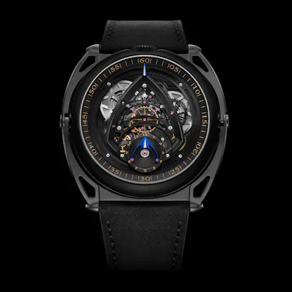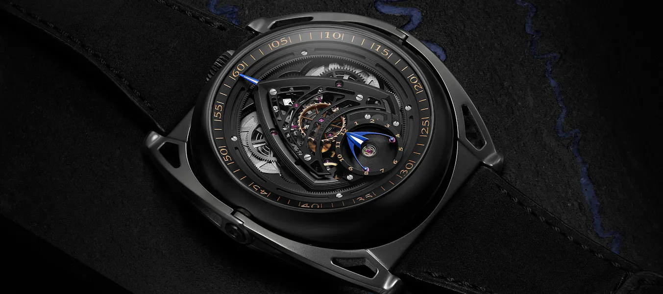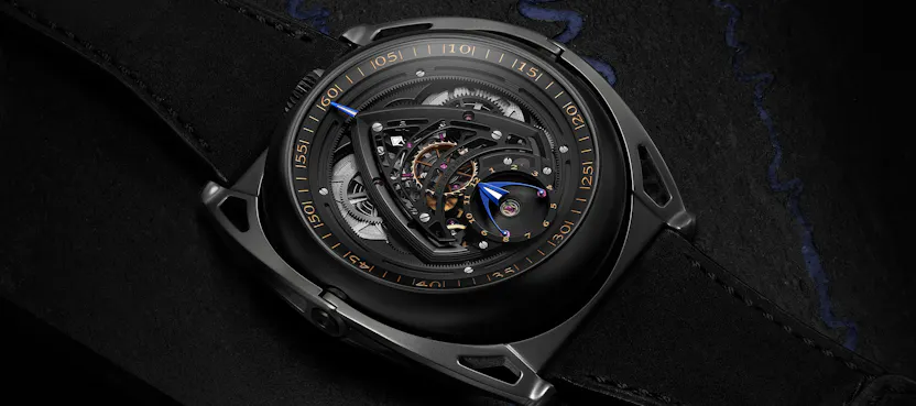 The case of the Season Three is in blackened titanium, and the articulated lugs are in zirconium (more often encountered in watchmaking in its oxide form, zirconium dioxide, which is the most widely used ceramic in watchmaking). Zirconium as an elemental metal is extremely tough – it’s extremely resistant to corrosion from water as well as strong acids or bases and it’s also very hard, heat resistant and generally an all around tough guy, finding uses in everything from the aerospace to nuclear industries.
