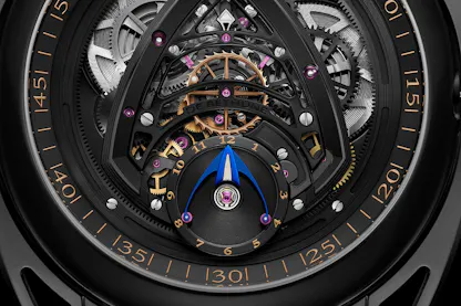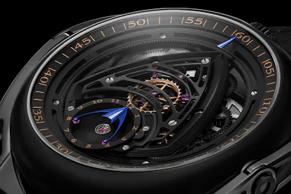 De Bethune suggests that the contemporary dial is best used as the home time display, which makes sense from a legibility standpoint; the classic face is instantly readable while checking the time on the contemporary side takes a fraction of a second longer thanks to the hour and minute displays. The hours are shown in a subdial in which an elongated delta shaped hand – the science fiction vibes are strong here – rotates once every twelve hours; the hand, or indicator if you prefer, is stabilized by two ruby rollers attached to its arms, which ride in a recess inside the vertical inner lip of the subdial; a satisfyingly intricate solution to showing the hours. Minutes are shown by a peripheral minute hand which rides on a disk with inward facing teeth at the periphery of the dial, driven by the movement motion works.