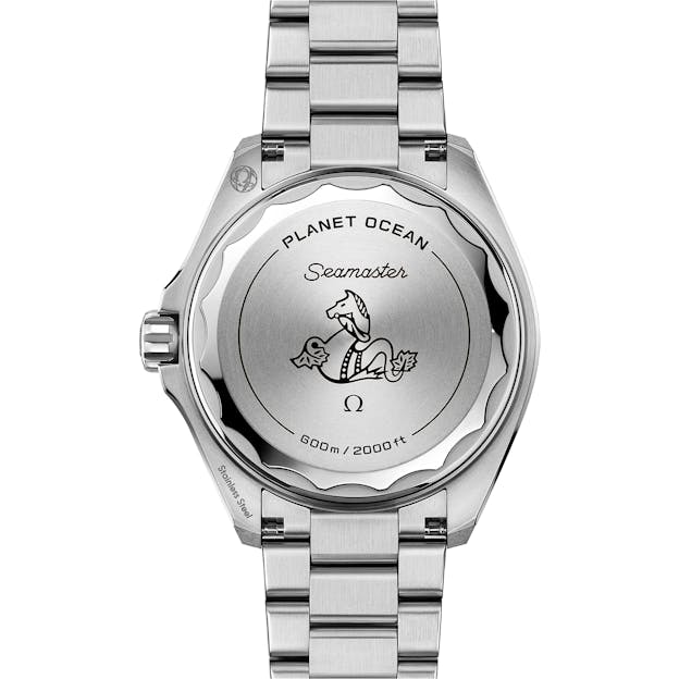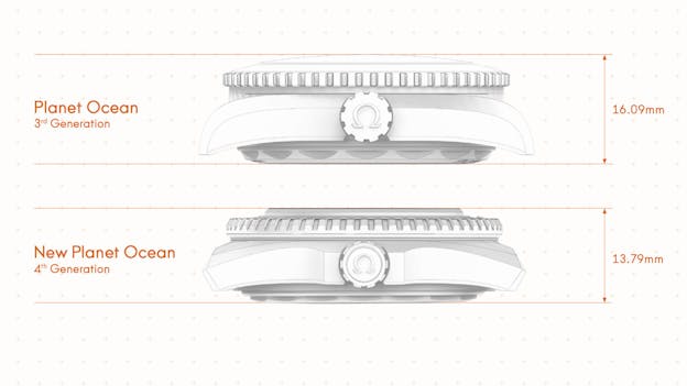 The outgoing 3rd generation models were 16.09mm thick, and 43.5mm in diameter; the new models are just 13.79mm thick, and 42mm in diameter, which makes it roughly equal in size to the Speedmaster Moonwatch. The bezels are of course still ceramic, and the new Planet Oceans retain arrowhead minute and hour hands found in all the preceding variants. The crystal is flat, rather than domed, and one of the biggest reductions in size looks to have come from shaving down the thickness of the back of the watch, which is – and this is one of the bigger design changes – no longer a display back.