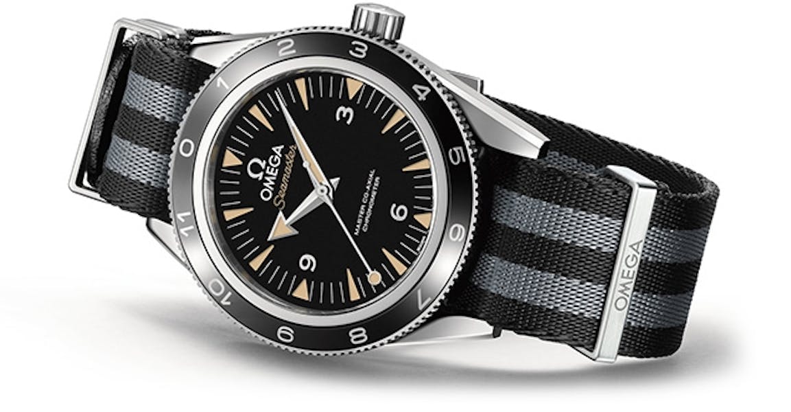 The remainder of the dial features the key elements that define the Omega Seamaster 300 in general production. The ghost of the vintage CK2913 asserts itself in force. The triangular indices with simulated radium patina, the clean matte black dial base, and the dauphine/broad arrow hand combination completes the effect. Significantly, Omega has chosen to place the luminescent pain in triangular hollows that add depth and even evoke the “sandwich” dial construction best-known for its ubiquity in the Panerai family.