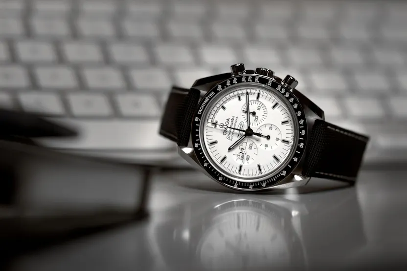 Omega goes to great lengths to ensure unique and exclusive content for owners of the Speedmaster Professional Moonwatch Silver Snoopy. Even the humble tachymeter scale receives massive qualitative upgrades in the form of a scratch-resistant ceramic surface and fully luminescent calibrations (Grey Side of the Moon-style). The crystal, which usually takes the form of acrylic (“Hesalite”) on standard-issue Moonwatches, here receives an upgrade to robust sapphire.