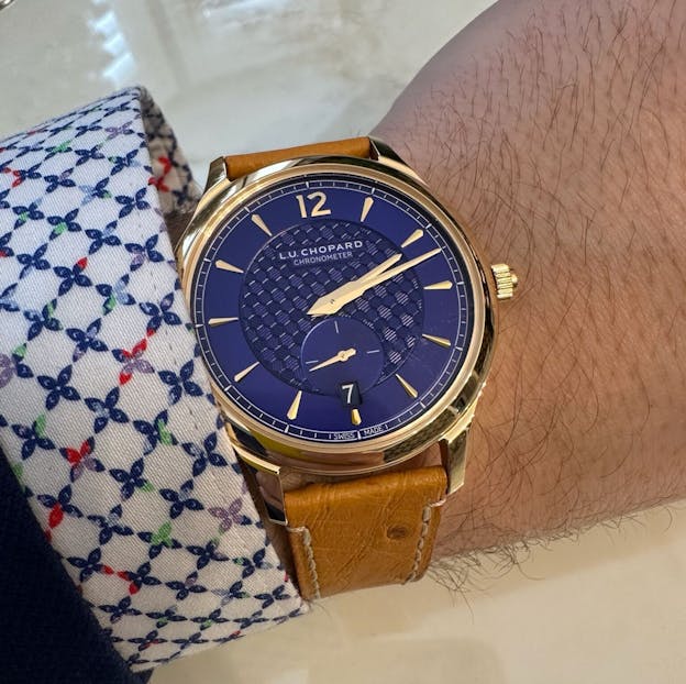 Measuring just 40mm by 7.7 mm thick and housed in a classic 18k yellow-gold officer style case with a hinged back. It’s a true dress watch if I have ever seen one. The dial is finished in a deep, saturated blue known as Bering Blue, a nod to the iconic blue door at 1 Place Vendôme, the Parisian address of, you guessed it, Chopard. The surface is decorated with Chopard’s signature hexagonal hand guilloché, a pattern also echoed on the exterior of the caseback. It is said that this honeycomb pattern is inspired by the brand’s long standing connection to bees. If you were wondering as was I, the bee first appeared in the mid-19th century on early pocket watches and movements produced in Sonvilier, where Louis-Ulysse Chopard founded the company in 1860. The symbol was engraved on movements as a quiet signature.