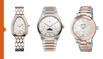 The independents have not been found wanting; there was simply no way they would leave this segment to the big players. Frederique Constant has just ramped up production of its Highlife collection (which includes a two-tone perpetual calendar) quite significantly. Maurice Lacroix’s quintessential Aïkon features gold and steel tones – not to mention a very daring blue dial. Still in the same price range, from the ‘house of the Eagle’, in the year marking the 200th anniversary of Napoleon’s death, Eberhard & Co has made the clever move of bringing out its Aiglon, available in various sizes, with a very striking mother-of-pearl dial. From there it’s only a small step through the world of mythology to curl a snake up next to an eagle – a step Bulgari has taken in style with its Steel & Rose Gold Serpenti Seduttori.