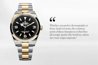 This is the most sought-after segment – and the most congested, with other giants such as Longines jostling for position too. The latter has its own two-tone offer, including both sports models (such as the HydroConquest) and more traditional pieces (like the Grande Classique). Baume & Mercier, another heavyweight brand, has always featured hallmark two-tone models, notably in its Classima collection. Another giant (in terms of output) in the field is Swiss fine watchmaker Tissot, with the two-tone Gentleman Powermatic 80 available at the unbeatable price of around $500, in the region of another brand that comes to mind less often: Victorinox (with its Alliance model).