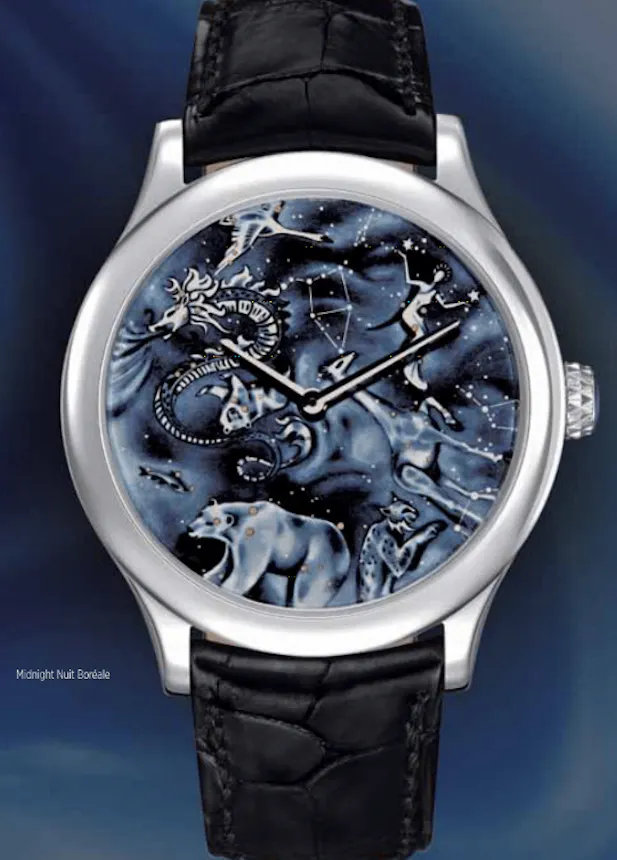Known for its whimsical designs and well-practiced savoir-faire, Van Cleef & Arpels creates the extraordinary dials collection that combines fine watchmaking with a masterful jeweler’s eye. Here, various decorative techniques, such as enameling, engraving and miniature painting, are employed to render each watch dial a singular—and yes, extraordinary—work of art. The Midnight Nuit Boréale and Midnight Nuit Australe look to the heavens for inspiration, rendering depictions of constellations and figures from Greek mythology.