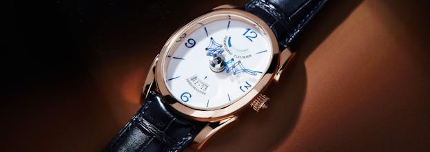 Reference number PFH775-1005401-HA3131. Case, 45mm x 37.6mm x 12mm; water resistance 30m. Dial, white lacquer finish; “Pantograph” hands. Movement, caliber PF111, hand-wound, 8-day power reserve running in 28 jewels at 21,600 vph. Strap by Hermès in indigo blue alligator. To see it in action check out Tim Mosso’s video review right here.
