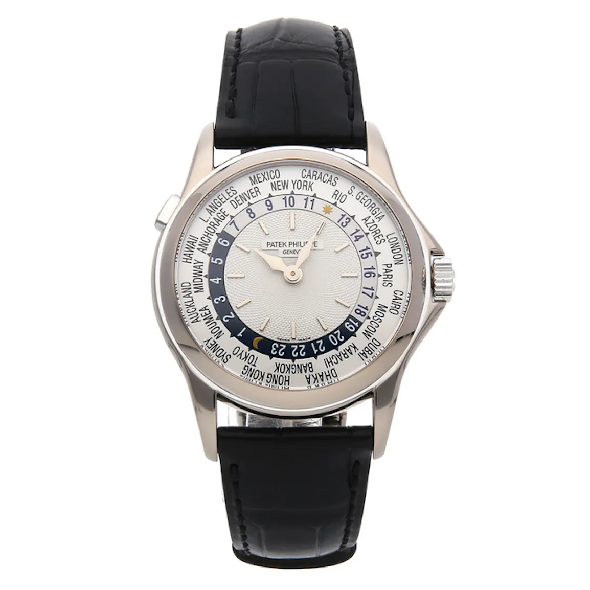 Simply align one’s current city with the index at 12 o’clock, set the local time, and Patek Philippe does the rest. A New Yorker can read the time in Dacca at a glance. A shaded semi-circle on the 24-hour ring advises the local AM/PM status.