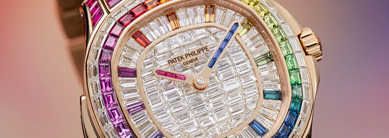 The latest complicated Aquanaut is the Aquanaut Luce Minute Repeater, which is the most complicated watch by a big margin to ever appear in an Aquanaut case. It’s also an unusual move in that, rather than releasing a Aquanaut repeater in a standard steel, gold, or platinum case, Patek has instead released its first Aquanaut as an elaborately gem-set watch in two versions – one with a rainbow gradient sapphire and diamond bezel, and another model with a fully gem-set bracelet as well. Both watches are in rose gold Aquanaut cases, with the distinctive curved Aquanaut grid dial re-interpreted in baguette cut diamonds, and with rainbow sapphire indexes, color matched to the adjacent sapphires on the bezel.