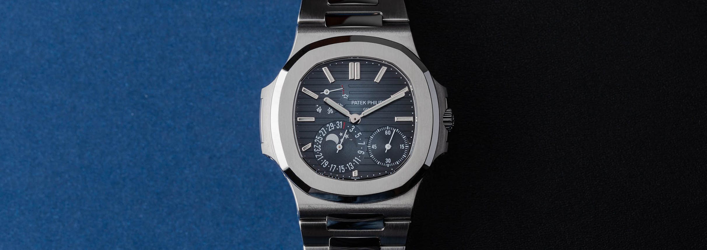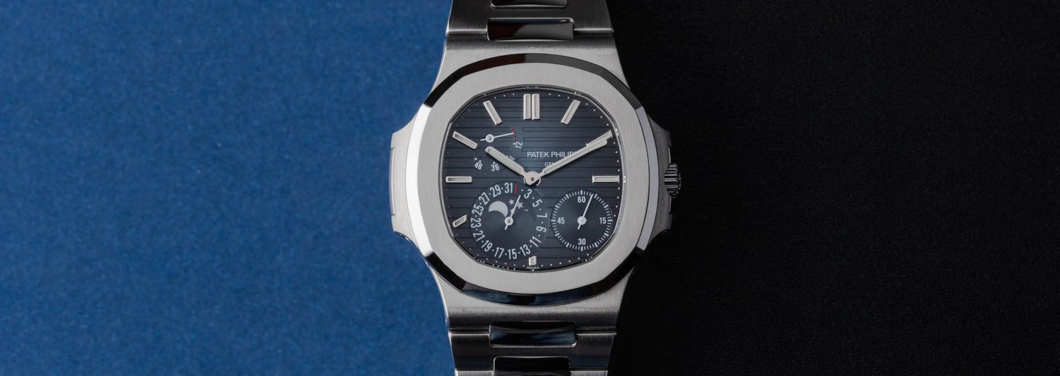 The 5712 was launched in 2006 to celebrate the 30th anniversary of the Nautilus collection. While it features the same case as the 5711, this complicated Nautilus offers the date, moon phase, small seconds, and power reserve indicator, positioned around the dial in a unique way. The 5712 features the blue dial, synonymous with the classic steel models. The watch is available in both rose gold, with a brown dial, and white gold with a grey dial.