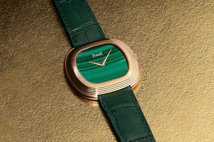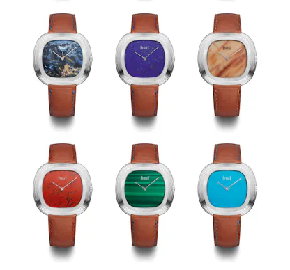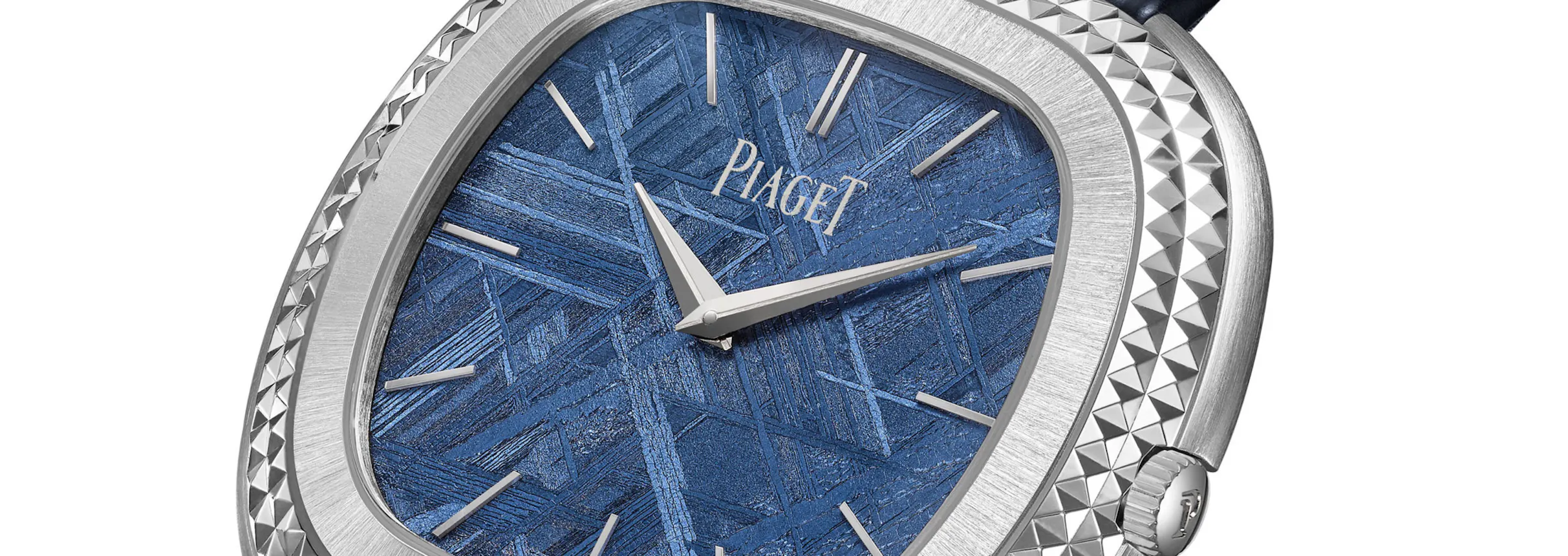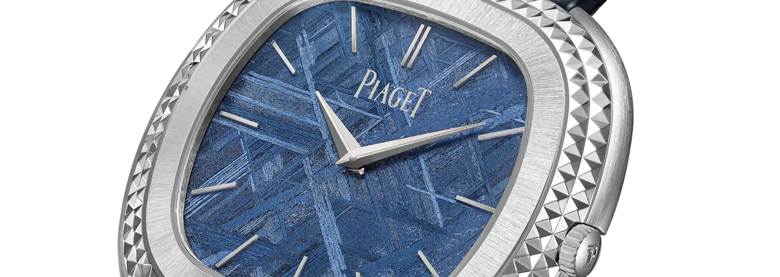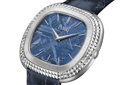The new model has a blue dial made from iron-nickel meteorite, which shows the characteristic, geometric Widmanstätten patterns which form inside meteorites when the parent body from which they come cools; the process takes millions of years and cannot be artificially duplicated. The angular shape of the patterns is a great visual echo of the Clous de Paris engraving on the bezel. However, the meteorite dial will not be the only option – Piaget is offering 10 different customization options, including 10 different ornamental stone dials, a choice of either white or yellow gold cases, and either dauphine hands, or the baton hands of the original.