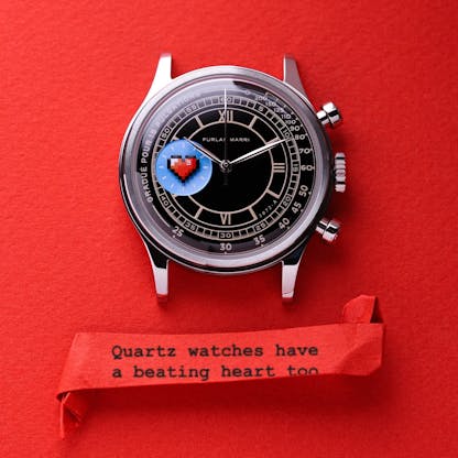 And if there’s one thing that gives watch people mixed feelings, it’s quartz. He leaned right into that tension with his collaboration with Furlan Marri—swapping the running seconds for a pixelated heart on their Nero Sabbia mechaquartz model, paired with the tagline: “Quartz watches have a beating heart too.” A tongue-in-cheek jab, sure, but also a genuine defense of the often-dismissed movement.