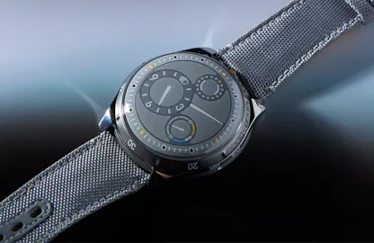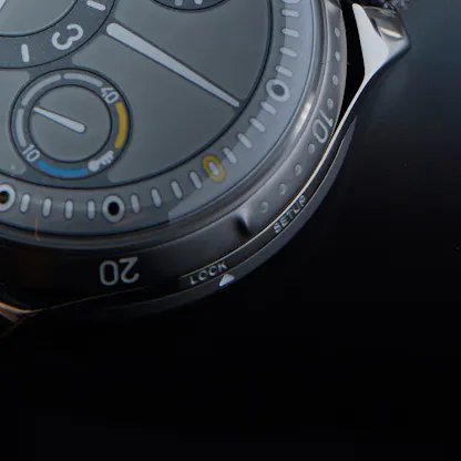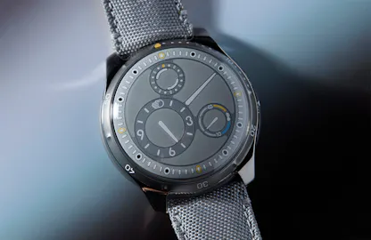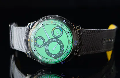 The Ressence Type 5 L: Case, grade 5 titanium with one way bezel; 46mm x 15.5mm and 100M water resistant. Movement, ROCS 5 system, with winding and setting via caseback RCLS (Ressence Compression Locking System). Magnetic transmission system. Automatic, 36 hour power reserve, running at 28,800 vph in 41 jewels. Price, $39,900; for more info, visit RessenceWatches.com.