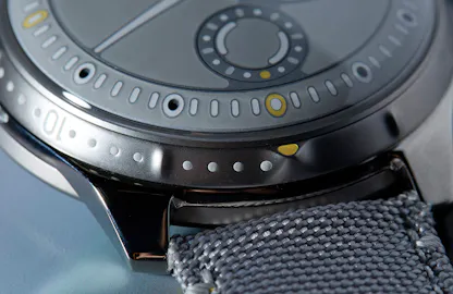 The Type 5 L follows the same basic blueprint as the very first Ressence ROCS watches. The upper half of the case is filled with oil, with the displays seeming to float on the surface of the domed sapphire crystal. The satellites carrying the displays are made of grade 5 titanium. Minutes are read off the central minute hand, hours off the hour subdial, and there is an oil temperature gauge, as well as a “runner” indication that rotates once every 90 seconds – this is a proof-of-function indicator, which is an essential element in a dive watch (generally this is handled by a running center seconds hand). The largest disk, carrying the minute hand, rotates once per hour, and the smaller displays are geared so that they always remain vertically oriented, so the watch can be read easily.The temperature gauge is calibrated from -5ºC to +55ºC (about 23ºF to 131ºF) and it shows the temperature inside the oil filled compartment, via a spiral of bimetallic metal.