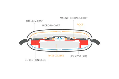 The watch is wound and set by rotating the turning caseback. The displays in the upper half are not mechanically coupled to the base caliber – instead, they are coupled by powerful but very small permanent magnets, which are contained in an alloy designed to provide a preferred pathway for magnetic field lines (the same basic mechanism by which soft iron antimagnetic inner cases and dials work).
