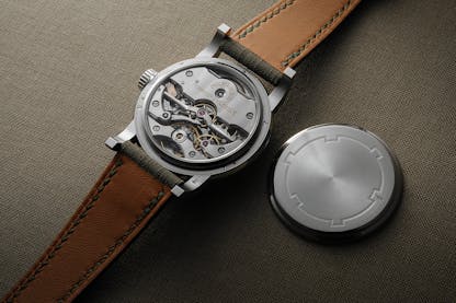 The steel case features a removable caseback which, when in place on the watch, seals the Faraday cage and, when removed, offers up a view of the stunningly finished movement through a sapphire display caseback. It’s a neat compromise and a nice callback to the construction of older watches, which often had both an external and inner caseback.