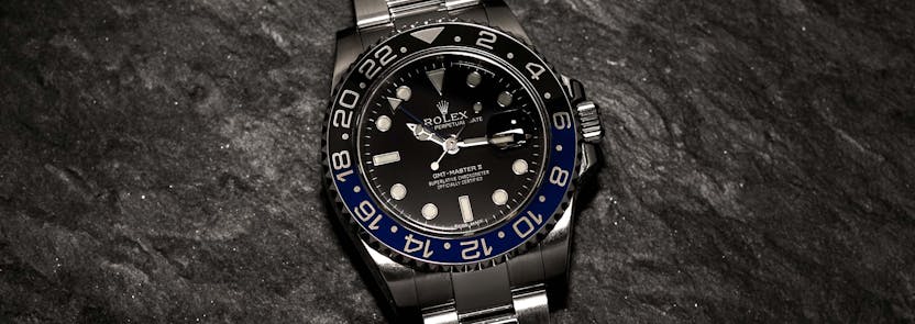 The Rolex Batman, similarly to the other GMT-Master II references, was created out of a monobloc case of Oystersteel. The bidirectional bezel features a 24-hour GMT scale with engraved numerals. The 40mm case is also waterproof to 100m thanks to the Oyster Perpetual case with screw-down crown and caseback. The calibre 3186 is a self-winding automatic movement with a 50-hour power reserve, instant date and is COSC certified.