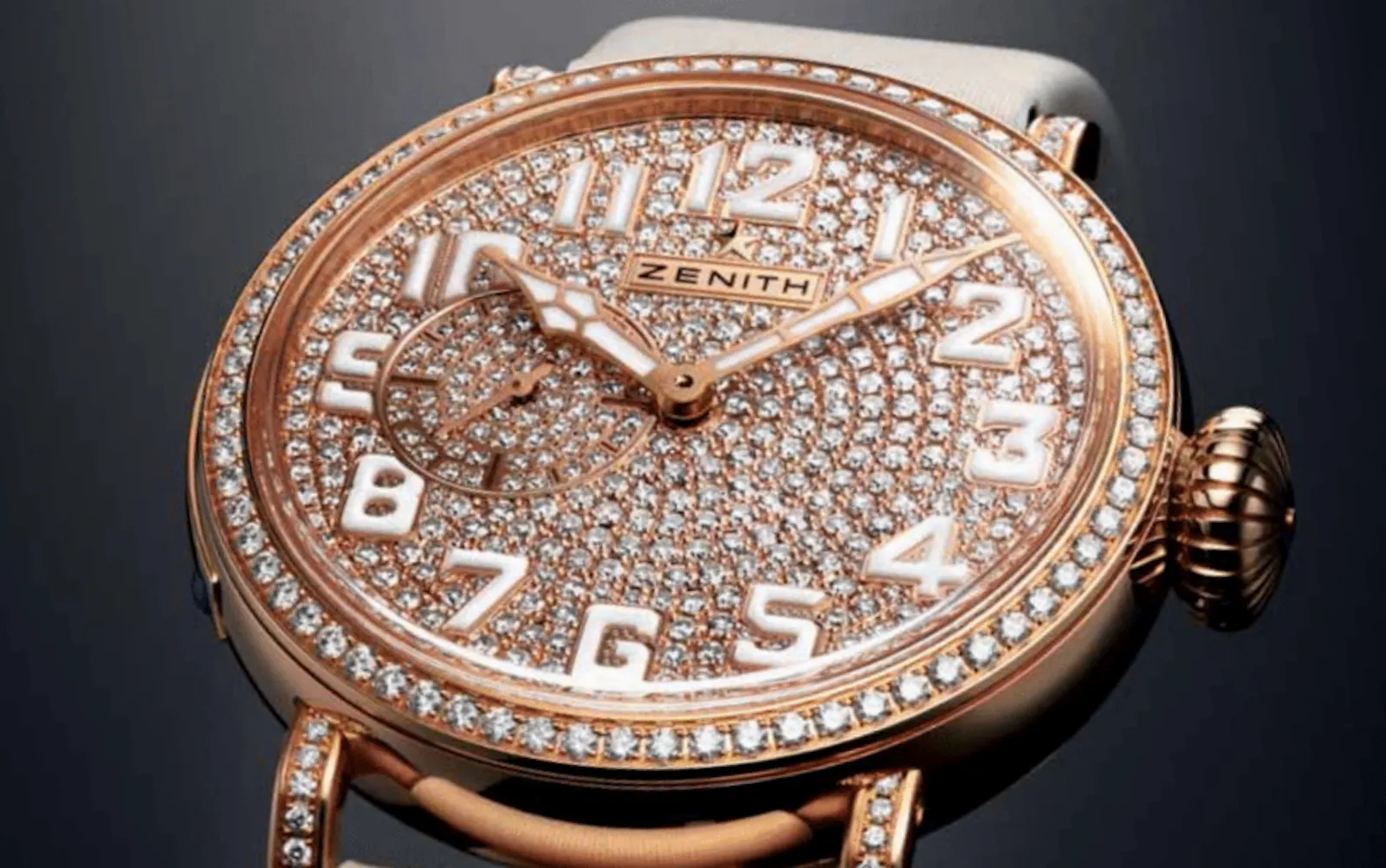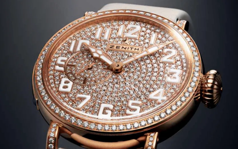 The Pilot Montre d’Aéronef Type 20 “40 mm Lady” is equipped with that unmistakable ratcheted crown, and the Zenith aviation instruments logo is engraved on the case back. In the full-set versions, which come in rose or white gold, the dial, bezel and lugs are embellished with about 3 carats of diamonds—no less than 491 of them in all. And resting atop this glittering display are the originally styled and large SuperLuminova-coated Arabic numerals. The indexes are black on the white gold model and white on the rose gold piece. The stylized hands also feature SuperLuminova coating.