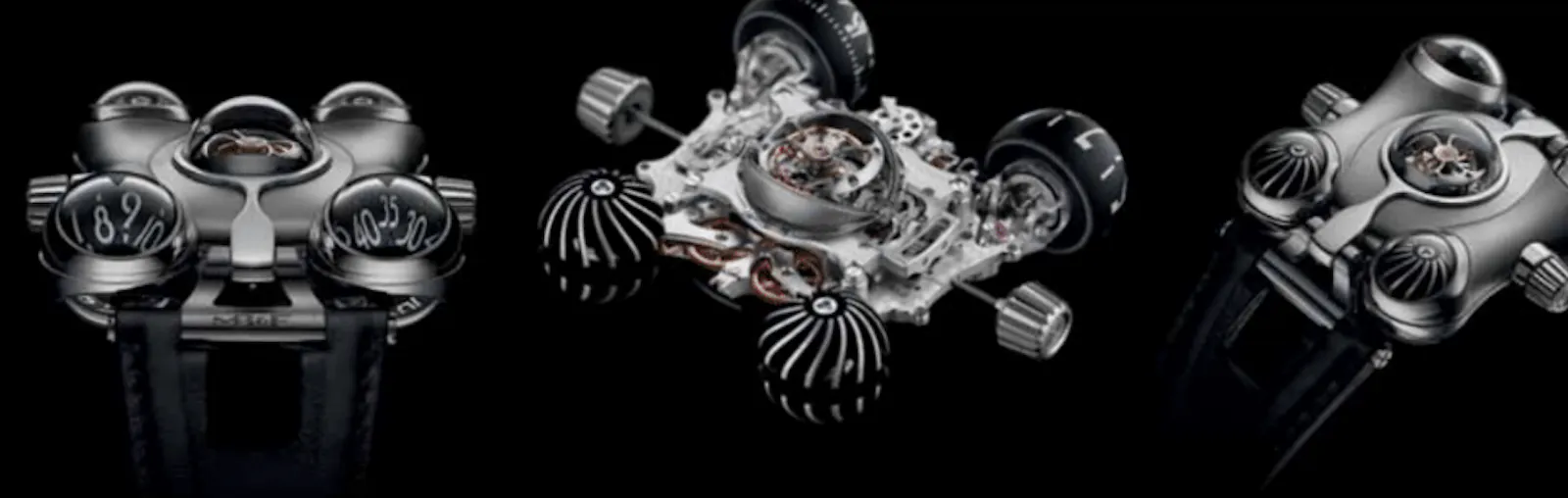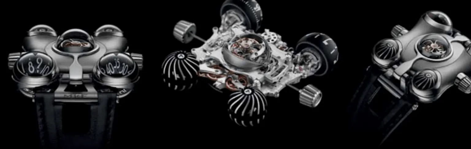 This shape explains why spheres dominate the design of the new MB&F HM6, which features five globes, an incredible ten sapphire crystals and two large crowns linked with a matte and polished titanium skin. Two of the globes echo the earlier MB&F HM3 Frog. On that model, a set of bugged-out eyes became the watch’s hours and minutes indicators just as they again do on this new HM6. Also, one edition of that earlier model was made with a titanium skin, just like the new HM6.