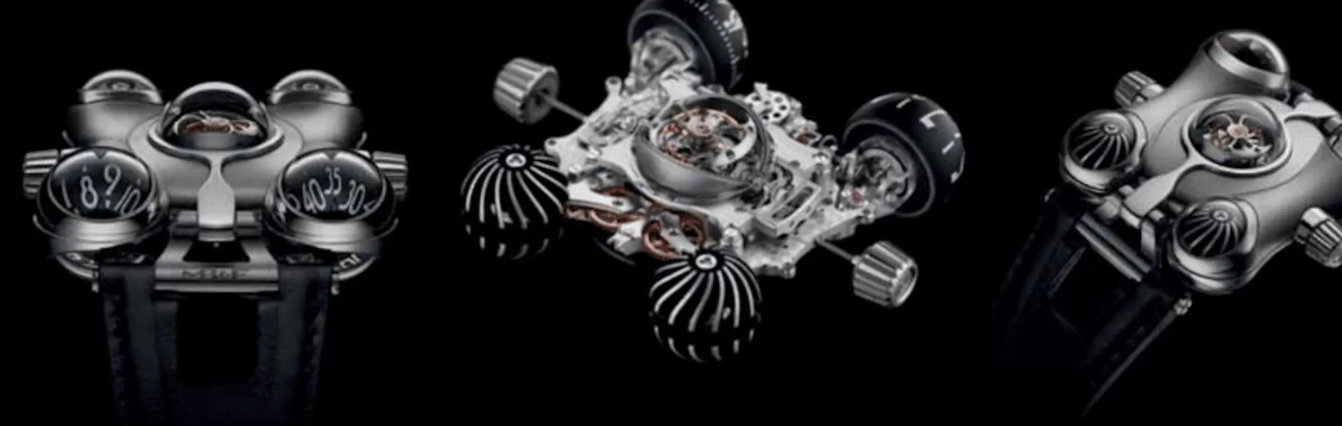 Just opposite each of the time indicator domes are two identical turbines that spin while the movement’s rotor spins. They are driven from the 18,000-bph rotation of the rotor by a gear train designed to amplify the number of rotations. With each shake of the wrist, these turbines spin at a much faster rate than the rotor rotates. The effect recalls a hypnotist’s spinning spiral, which only underlines the kinetic sculptural appeal of the HM6 Space Pirate. These two oft-spinning turbines are each composed of fifteen curved vanes machined in two hemispheres from solid blocks of aluminum. Their purpose, outside of their quite effective aesthetic role, is to govern the speed of the rotor to ostensibly “minimize wear.”