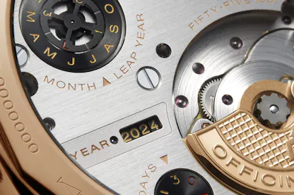 Unlike many other perpetual calendar designs, the in-house P.4100’s indications can be adjusted forward or backward without the need to account for any periods during which adjustment could potentially damage the movement. KIF shock protection ensures that the entire package can withstand common jolts and knocks, while 50 meters of water resistance means that — in keeping with Panerai’s legacy — the Ref. PAM01575 can hold its own in the pool. (In fact, it even ships with a dark blue rubber strap to swap with the included blue alligator leather model featuring a white gold pin buckle.)