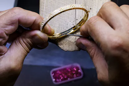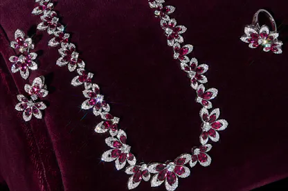 The house’s latest high-jewelry collection, Tiarè, features exceptional-quality red spinel gemstones, specifically cut and faceted just for Roberto Coin. “They look like rubies, but come at a significantly different price,” says Coin, a longtime admirer of red stones — since his start, he has set a ruby inside every design to touch the skin, symbolizing good fortune and love from the brand. To highlight spinel’s rich, vivid hue, marquise-cut stones are arranged in graceful floral motifs across necklaces, earrings, and rings crafted in gold and diamonds. The designs play with the light to enhance the stone’s natural radiance and depth of color.