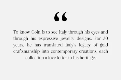 To know Coin is to see Italy through his eyes and through his expressive jewelry designs. For 30 years, he has translated Italy’s legacy of gold craftsmanship into contemporary creations, each collection a love letter to his heritage. Liquid gold chains flow like silk against the skin, bold cuffs sprinkled with diamonds mirror the stars reflecting on the canal at night, and colorful gemstone rings are as vibrant as Murano glass.