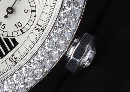 The monopusher chronograph is, I suppose, obsolete from a technical standpoint — it’s undoubtedly an advance to be able to use one pusher for starting and stopping and a second for resetting. But there is an elegance to the monopusher design which no two-pusher chronograph can quite equal, if you ask me. This is not to say there aren’t very beautiful and very elegant two pusher chronographs; even a cursory glance at Patek’s history will reveal many, but the monopusher chronograph’s clean lines are hard to beat. In the case of this particular watch, you get something extra. The white gold case is set with brilliant-cut round diamonds, and on the lugs as well, giving the watch even more of a Roaring Twenties sense of opulent and assured luxury.