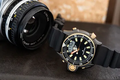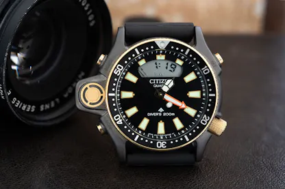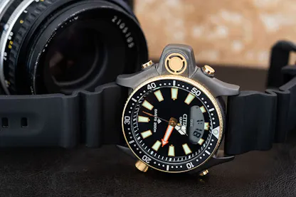 The Citizen Aqualand is at first glance, an unlikely candidate for a cult watch. Born in 1985 and called the “diving robot” in contemporary advertisements, the Aqualand preceded the official launch of the Promaster family of watches by four years, and was the latest development in water resistant watches from Citizen, going all the way back to the 1959 Parawater, which Citizen famously tested by suspending the watches underneath buoys set adrift in the ocean to study currents (one of the buoys, watch still attached, made it all the way across the Pacific to Manzanita, Oregon, where it washed ashore in 1966). The Aqualand was, however, a first – specifically, it was the first diver’s watch with an electronic depth gauge, and it had a whole plethora of additional features, designed to make the inherently hazardous activity of scuba diving as safe as possible. Functions included constant measurement of depth, dive time measurement, maximum depth memory, a dive log capable of storing information on previous dives, including maximum depth and dive time, a rapid ascent alarm, and a sensor which would automatically switch the watch into dive mode when immersed in water. Incredibly sophisticated for its time, the Aqualand was the first of a whole line of electronic dive watches from Citizen – but it was also the last purpose built, multifunction dive watch intended as a primary diving tool, appearing just as the first versions of modern dive computers were hitting the market.