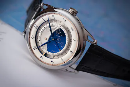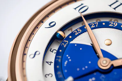 There are three concentric rings from which information is read off. The innermost ring is for the date, and frames a stylized representation of the Sun, and the night sky; these are next to the daylight/nighttime sections of the home time ring. This is not, strictly speaking, an AM/PM division; instead, the 24 hour home time ring is separated into one nighttime section (6PM to 6AM) and one daylight section (6AM to 6PM). Home time is indicated by a tiny sphere divided into a gold hemisphere, and one in heat-blued steel. When the sphere passes 6AM, it rotates to show the gold hemisphere and at 6PM, it switches over to the blued steel hemisphere.