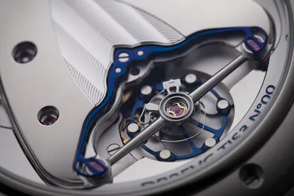 Finally, the balance bridge is fixed in place by De Bethune’s triple pare-chute antishock system, which provides additional shock protection but which also helps re-center the balance pivots more rapidly if the watch receives a shock.