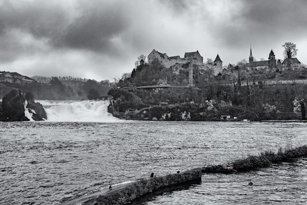 The development of a town centered around manufacturing and shipping at the Rhine Falls, or Rheinfall (auf Deutsch) was a natural one, partly thanks to readily available water power, and partly due to the fact that the falls were an obstacle to navigation. The Rhine Falls are the largest falls in Europe, at nearly 500 feet wide and 75 feet high and peak waterflow is 8,800 cubic feet per second, on average, in the wintertime when the flow is greatest. Since passing the falls by boat is not only impossible, but suicidal, shipments traveling down the Rhine were unloaded above the falls and portaged to points below, where they could be reloaded onto ships for the remaining journey – to Basel, or perhaps through Germany or even to the Netherlands, where the Rhine eventually reaches the North Sea.