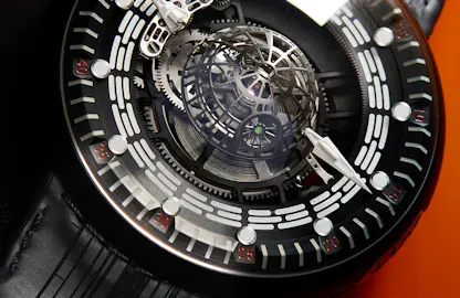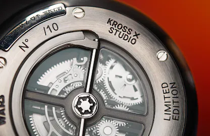 The Kross X Studio Death Star Tourbillon: case, DLC coated titanium, 45mm x 20mm including crystal (without crystal, 12.5mm), with sapphire front and back, water resistant to 30M. Four individual sapphire panels on the caseback, with D-ring crown; function switching button at 3:00. Movement, caliber KS 7 000, hand-wound central tourbillon, running at 21,600 vph/3Hz in 27 jewels; five day power reserve. Storage case in the form of a kyber crystal carrying box, with replica kyber crystal storage capsule, two additional capsules for straps and the watch, and additional free storage space. Storage capsules in aluminum, 337.5mm x 113mm; weight, 2.7kg. Kyber crystal container, 1200mm x 22.4mm, weight 80kg; wood, aluminum and black polymer, 732 parts total with LED control panel and manifest panel. Official collaboration with Disney and Lucasfilm.
