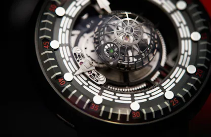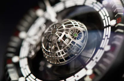All that, and we haven’t even gotten to the main event yet. The dial is dominated by a central tourbillon with a cage shaped like the original, planet-destroying Death Star (“Alderaan tested, Empire approved!”) which rotates once per minute and has a disk resembling the firing aperture for Death Star’s super-laser, including a central green dot. The hour hand is in the shape of the Imperial-class Star Destroyer seen first in the opening moments of A New Hope and the minute hand, with a little more room to stretch out, is a miniature of the Executor-class Super Star Destroyer (well, for the detail-minded enthusiasts among you, the Executor-class Star Dreadnought, brought to you by those hard-working folks at Kuat Drive Yards) and the former is carried on an assembly of satellite gears that lend a fine, fanatically mechanistic touch to the proceedings.