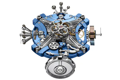 The MB&F Horological Machine 11 “Architect:” case, grade 5 titanium; display markers consisting of conical stainless steel rods with beads in polished titanium and aluminum; 42mm x 23mm with 20M water resistance. Sapphire crystals front and back and on each of the faces and crown. Case consists of a total of 92 components. Movement, “horological engine” with display of the time, power reserve, and temperature via a thermometer with bimetallic coiled strip; central flying tourbillon running at 18,000 vph in 29 jewels. Limited edition; Blue or Rose Gold versions, 25 each worldwide. Price at launch, CHF 198,000/USD 230,000. For more information, visit MB&F.