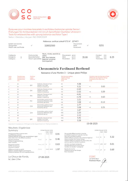 The Naissance d’une Montre 3 exceeds COSC chronometer certifications significantly; the COSC standard mean daily rate variation for 30mm movements is -4+6, with the Naissance d’une Montre 3 Ferdinand Berthoud showing a mean day rate variation across positions of 0.91 seconds.