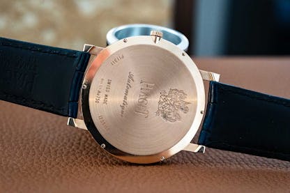 Unlike some more recent record setting ultra thin watches, the Piaget 910P feels very much like a classic piece of ultra thin watchmaking. The case is rose gold, not some more exotic material chose for its rigidity, and while the layout on the dial side is certainly unusual, the watch overall doesn’t feel like an overt attempt to set a record, but rather, like an ultra thin watch designed to do what, traditionally, ultra thin watches were meant to do, which is to show the time in an urbane, sophisticated, and tasteful way.