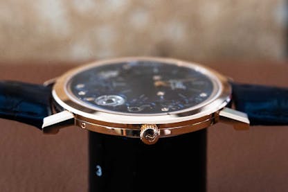 The rotor for the automatic winding system is a thin crescent on the periphery of the movement (it’s gold, in this case with a blue PVD treatment) and it’s barely visible, although the caliber number’s printed on it which makes it easier to see its oscillations. Despite the extreme thinness of the watch, the power reserve is quite respectable at 48 hours, with the balance vibrating at 3Hz/21,600 vph (slightly slower than the 4Hz/28,800 vph rate of most contemporary movements, which probably contributes to the ability of the watch to achieve a 48 hour power reserve with a very flat mainspring).