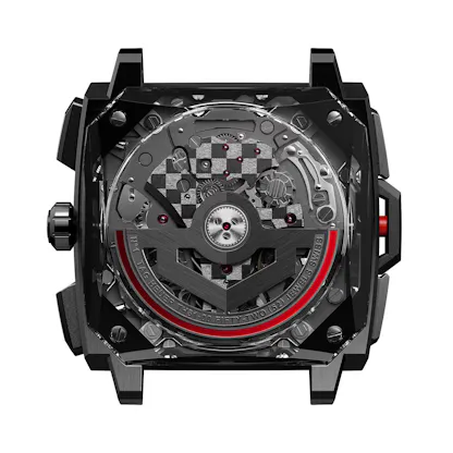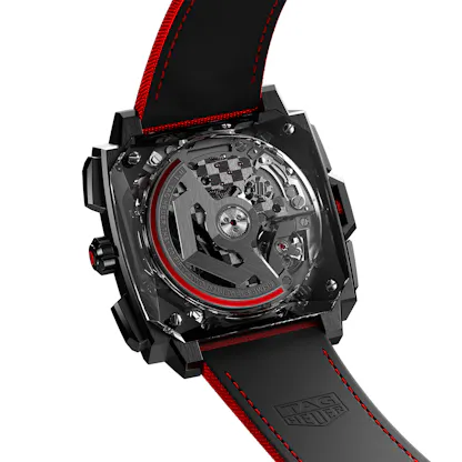 The design is an evolution of well known TAG Heuer design codes – the front and rear box crystals give the watch both a sense of substantial construction, and transparency and in particular, as seen from the back, the oscillating rotor seems to float above the rest of the movement.