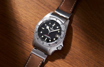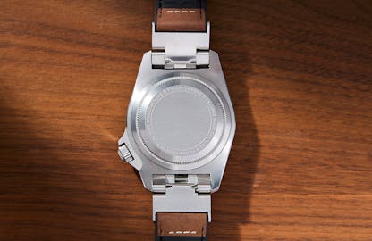 The P01 also comes on a leather strap, which seems an unusual choice for a dive watch, although the sides and back of the strap are sheathed in rubber, which will add to strap longevity. The case feels very much a product of a design program directed at producing a candidate for use in the field – surfaces are brushed to reduce reflections, and in general, decorative beveling is absent, contributing to the P01’s no-nonsense personality.