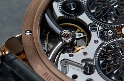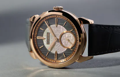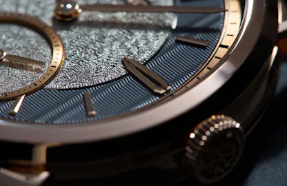 The current production encompasses three distinct iterations: 7 in rose gold, 9 in platinum, and 25 in tantalum. Each unit bears a unique serial number and showcases distinct sector dial variations tailored to the specific material of the case. In the rose gold variant, a contrasting gray guilloche and a champagne-toned hammering, both meticulously applied by hand, adorn the dial. Platinum editions exhibit two distinct guilloche patterns, with the outer track featuring a honey gold tone and the inner track boasting a rich metallic brown. Lastly, the tantalum version (my favorite of the lot) showcases a dark gray frosted outer track paired with a dark blue aventurine for the inner dial and sub-seconds.