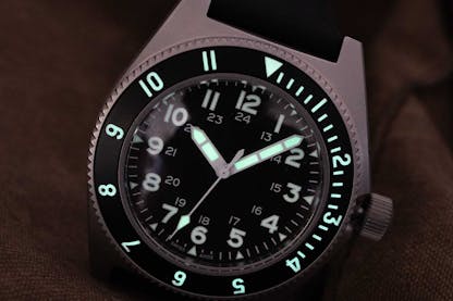 While the Mark 2 is absolutely and resolutely devoid of frills and flourishes, the DTU (the letters look like an acronym but are not; they’re just a standard military specification code, as far as I have been able to determine) has a very slight nod to design in the beige lume, but only slightly, although the downside to the use of this color is that it’s slightly less luminous that blue-green emission Super-LumiNova. The use of what used to get called “fauxtina” lume has become sufficiently well established as a design trope in vintage inspired watches that nobody bothers much with the term anymore – if you really wanted to drag a military spec modern version of a vintage milspec watch I suppose you could say that it is an attempt to dress in stolen glory but such a criticism strikes me nowadays as at best, overkill.