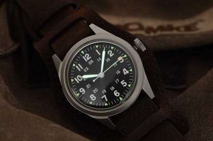 The modern version runs an ETA 2671 caliber, which is a little bit of a legacy movement at this point, having been produced since 1971 but I feel it suits the character of the watch. It’s a smaller movement, at 17.2mm in diameter (with a 38 hour power reserve) and only its mother would call it “fine” but then again, this is a watch designed for pretty hard daily use, not for drawing squeals of admiration for its aesthetics. It also suits the fact that this is a smaller watch, in keeping with the by-modern-standards diminutive size of the original – the new watch is 34mm x 10.90mm, and it is water resistant to 100M and you get a domed sapphire crystal as well (and a sterile dial).Benrus notes that the cal. 2671 is a native no-date caliber, so there’s no ghost position for the crown, which is a small but satisfying detail.