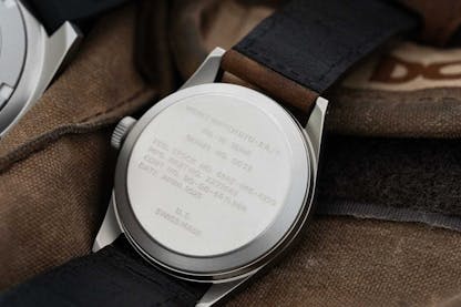 MIL–W-3818B like MIL-W-50717, is painstakingly thorough in detailing the asks. The document specifies tritium lume (which has long since been largely replaced by SLN, as tritium has a fairly short half life and begins to dim noticeably after just a few years) and the watch is required to have 17 jewels, a “solid, monometallic nonmagnetic balance wheel,” a Nivarox-type balance spring, and a power reserve of 36 hours. Notably, the requirements specify that the watch should have “endstone jewels secured in a manner which will facilitate cleaning and oiling” so these were not meant to be throwaway watches. The spec also specifies a stop seconds hand, and has isochronism requirements similar to MIL-W_50717.