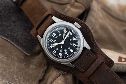 The second watch that came along for the ride is the DTU Field Watch, which is built around the MIL-W-3818B spec, from 1962 (which was itself an update to MIL-W_3818B, originally published in 1956). To give it its proper name, this is the DTU-2A/P, which first saw he light of day in 1962 in response to the updated milspec, and the new watch follows the spec as well.