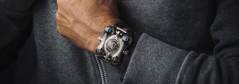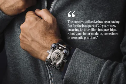 In contrast to all this, the modernist strand is characterised by its complete creative freedom. In this register, the tourbillon is fully emancipated. And in that respect, it would be difficult not to mention MB&F. The creative collective has been having fun for the best part of twenty years now, encasing its tourbillon in spaceships, robots, and lunar modules, sometimes in acrobatic positions. The Horological Machine (HM) and Legacy Machine (LM) have conquered high-ranking collectors, who have homed in on these creations – sometimes disturbing, always impeccably made.